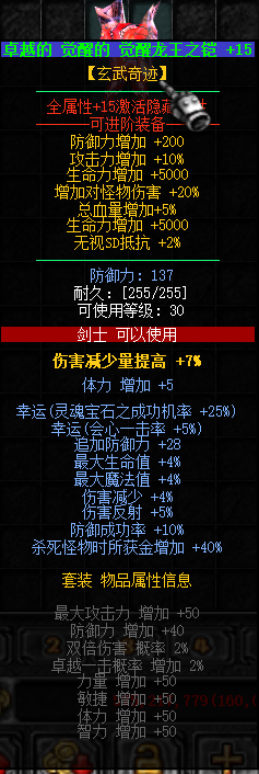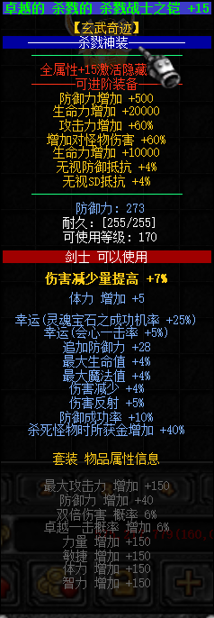 【玄武级别装备】 可进阶到杀戮装备! 用卓越宝石砸到全属性+15可激活变异属性。 使用【杀戮进化宝石】点它,成功后随机进阶为杀戮装备,失败无惩罚! |