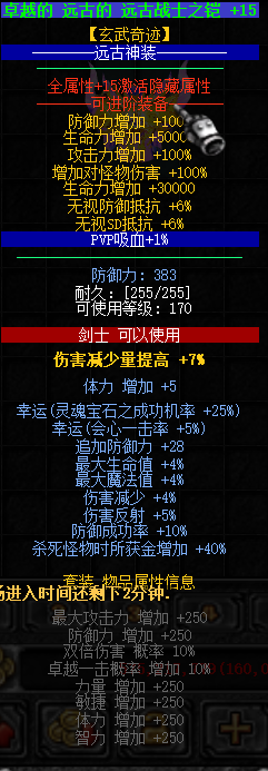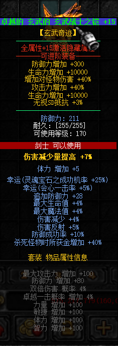 【觉醒级别套装】 可进阶到玄武装备! 用卓越宝石砸到全属性+15可激活变异属性。 使用【玄武进化宝石】点它,成功后随机进阶为玄武装备,失败无惩罚! |