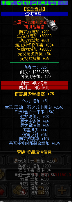 【杀戮级别装备】 可进阶到造化装备! 用卓越宝石砸到全属性+15可激活变异属性。 使用【造化进化宝石】点它,成功后随机进阶为造化装备,失败无惩罚! |